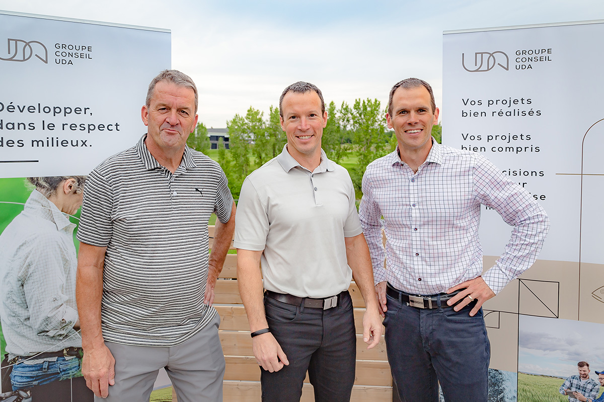 Vignette : Stéphane Lambert, ing. et vice-président de la division Akifer inc., Frédéric Fulham vice-président du Groupe Conseil UDA inc. et président de la division Akifer inc. et Jean-François Poirier, ing. et agr., président du Groupe Conseil UDA inc.